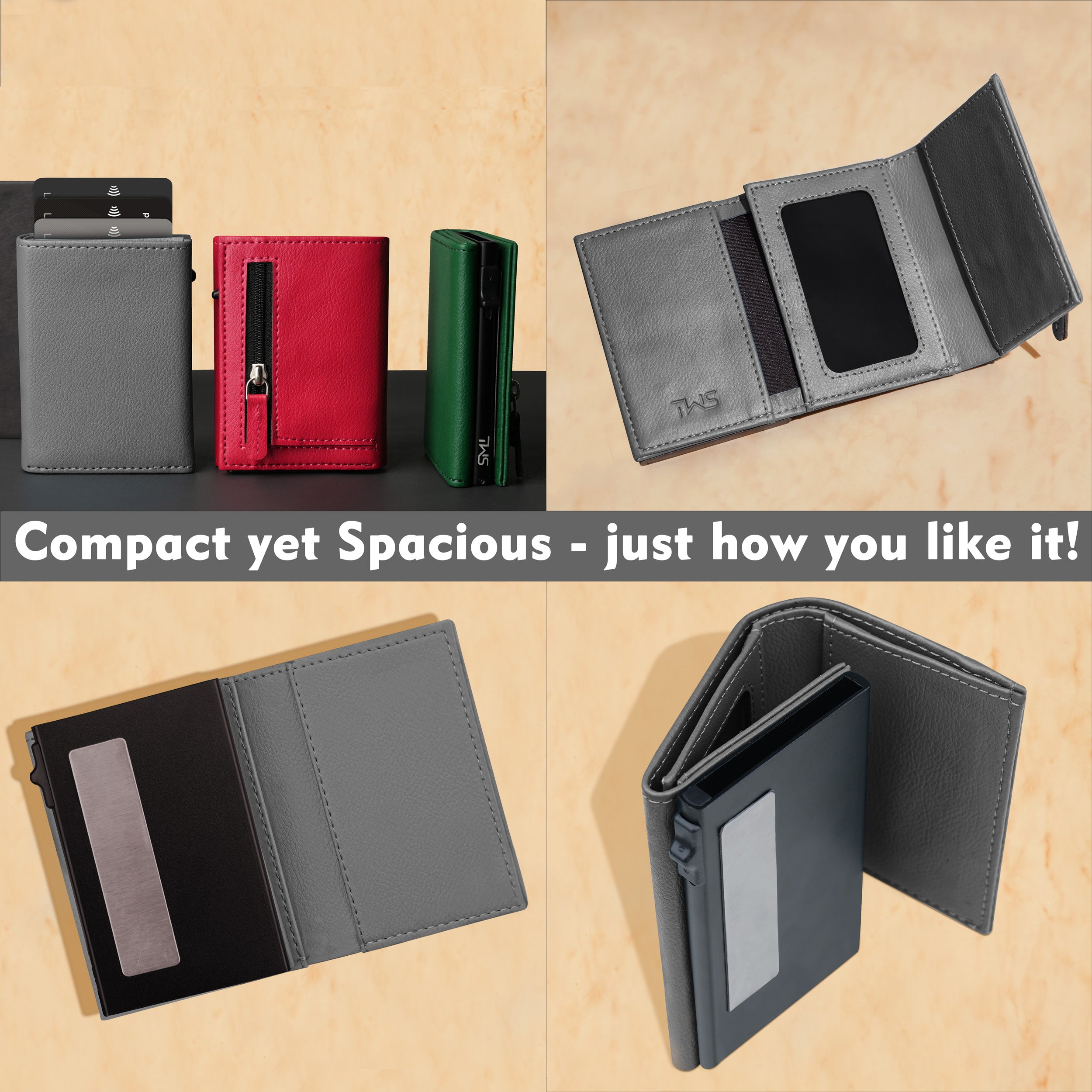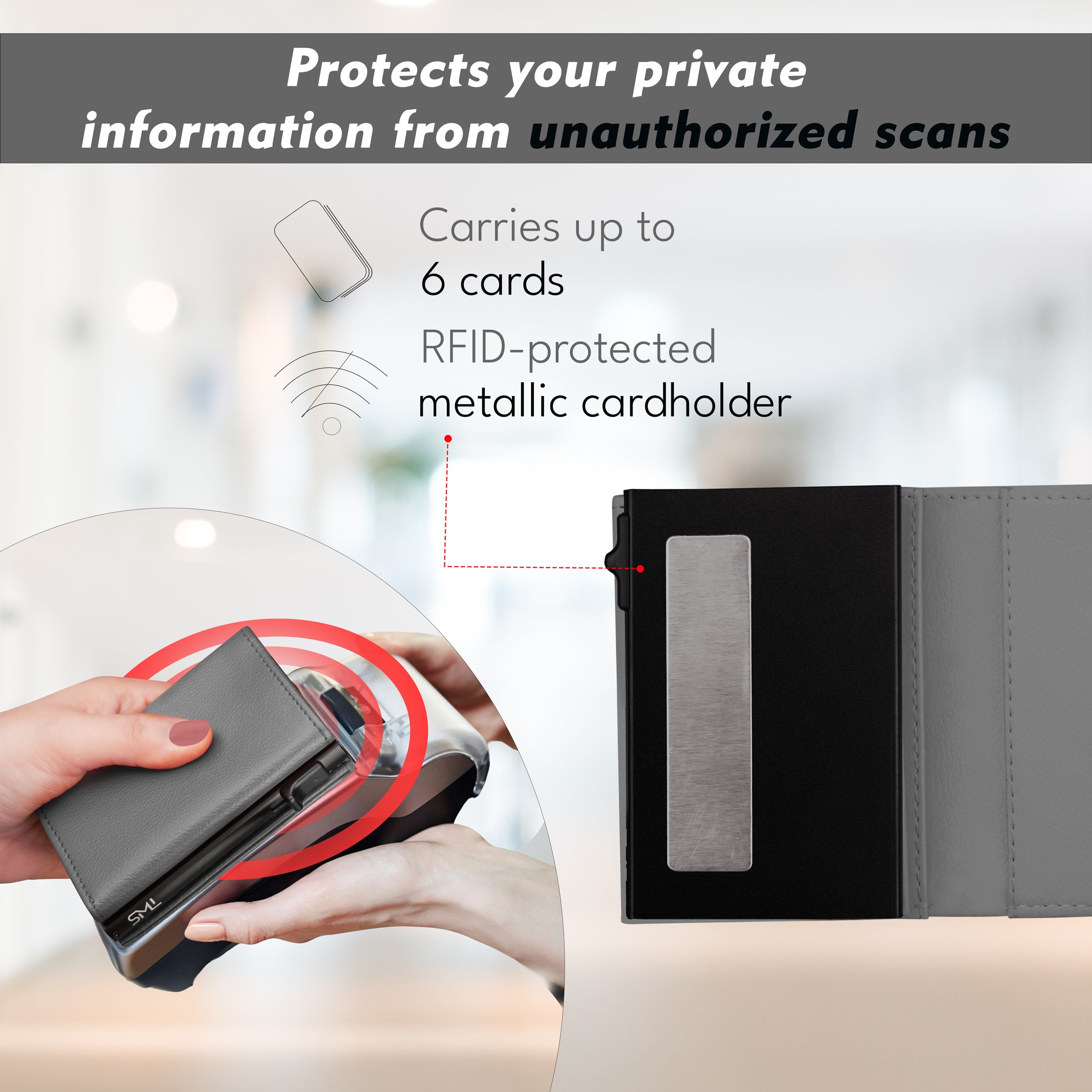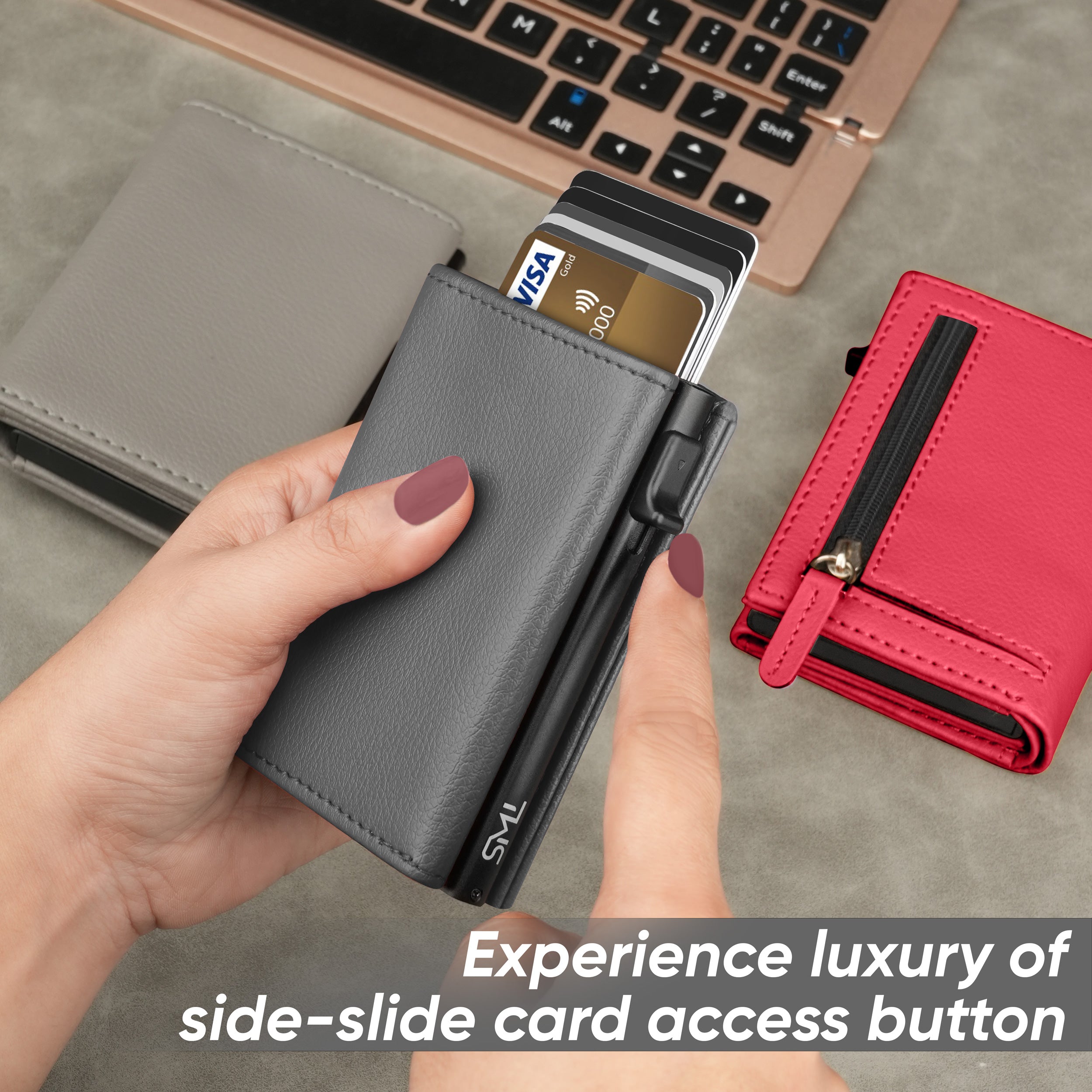 This stylish wallet combines sleek design, bold color choices, cutting-edge security features such as an RFID-blocking cardholder that pops up, and the kind of heartfelt charm that few others can provide. This wallet matches any outfit whether one is going to work, running errands, or attending an event.