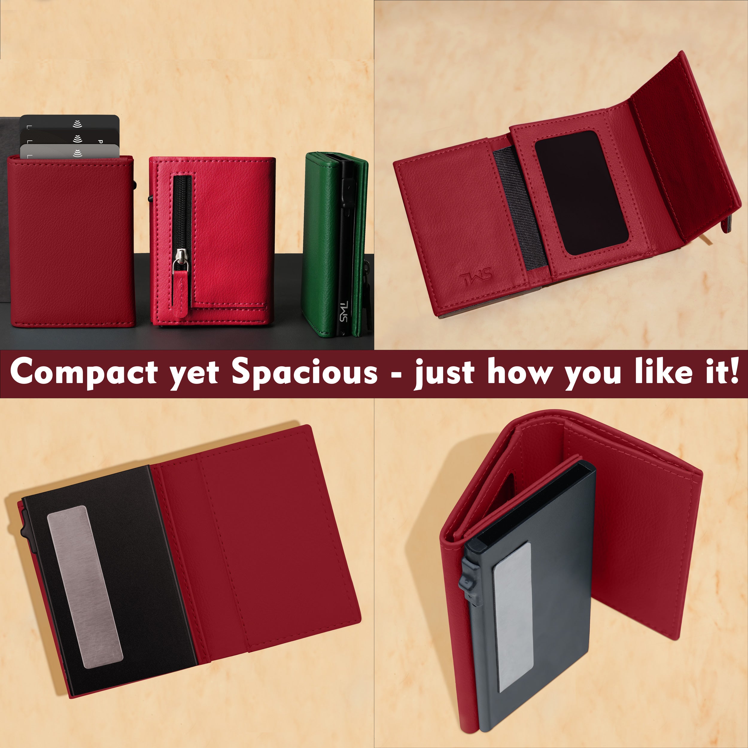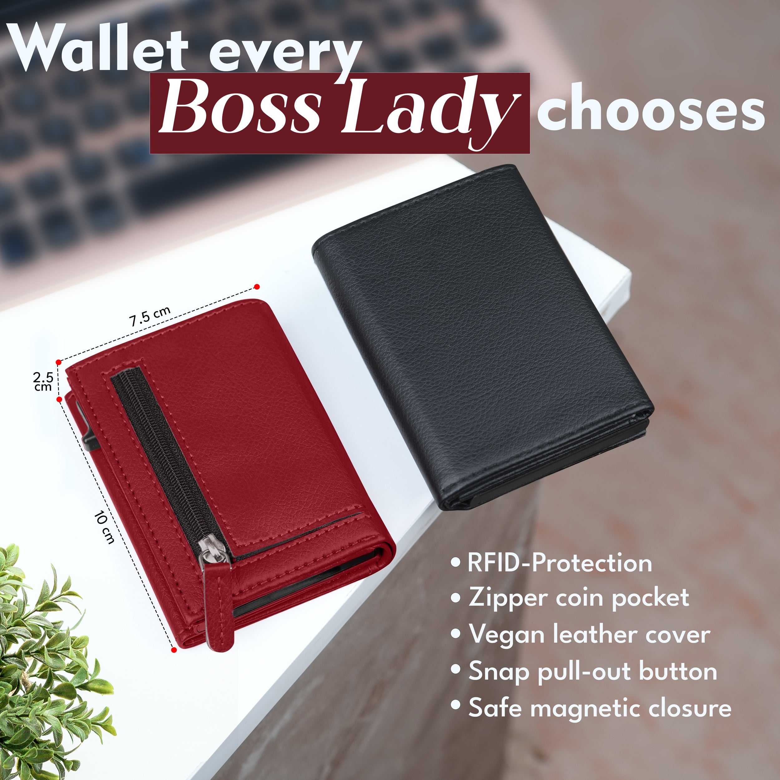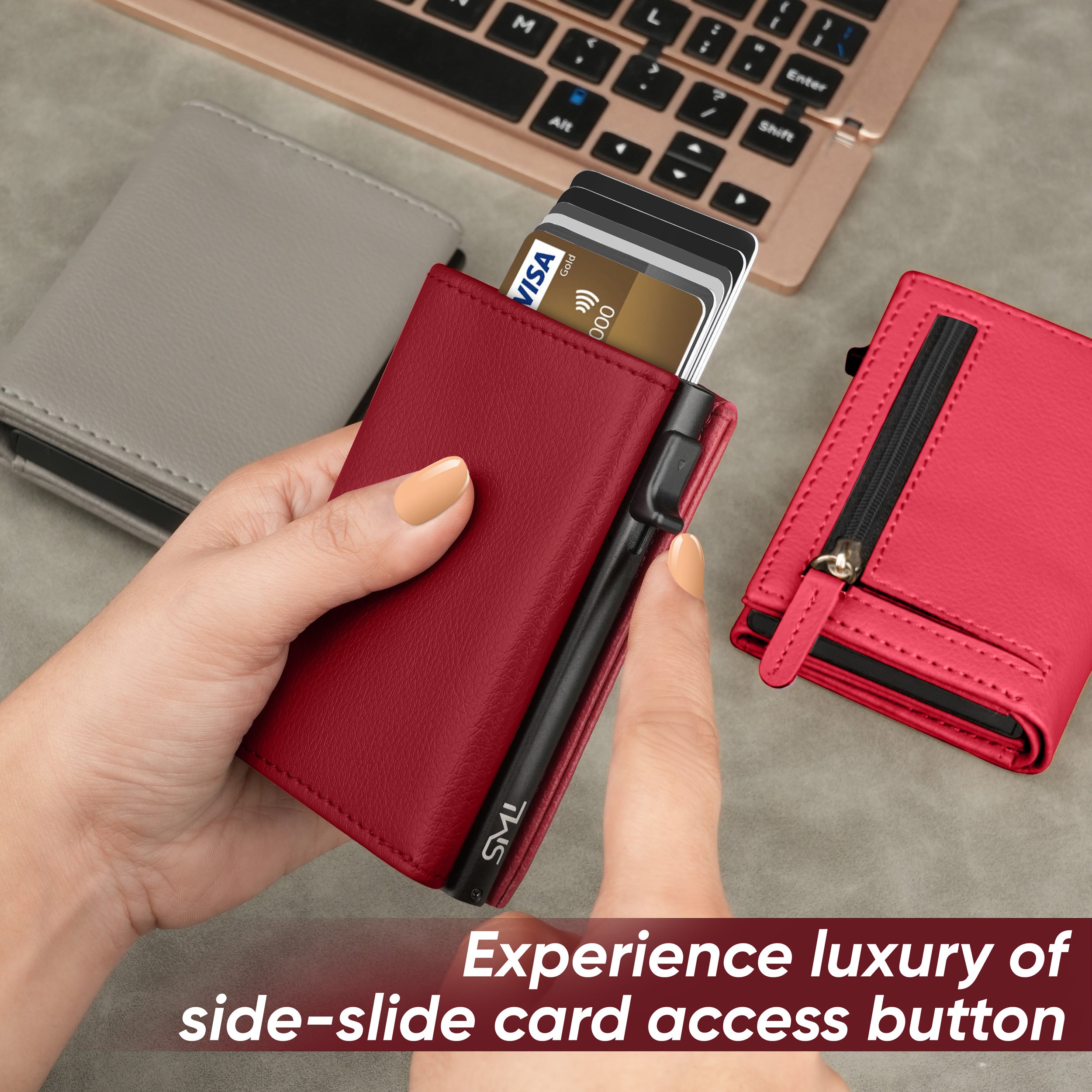 This stylish wallet combines sleek design, bold color choices, cutting-edge security features such as an RFID-blocking cardholder that pops up, and the kind of heartfelt charm that few others can provide. This wallet matches any outfit whether one is going to work, running errands, or attending an event.