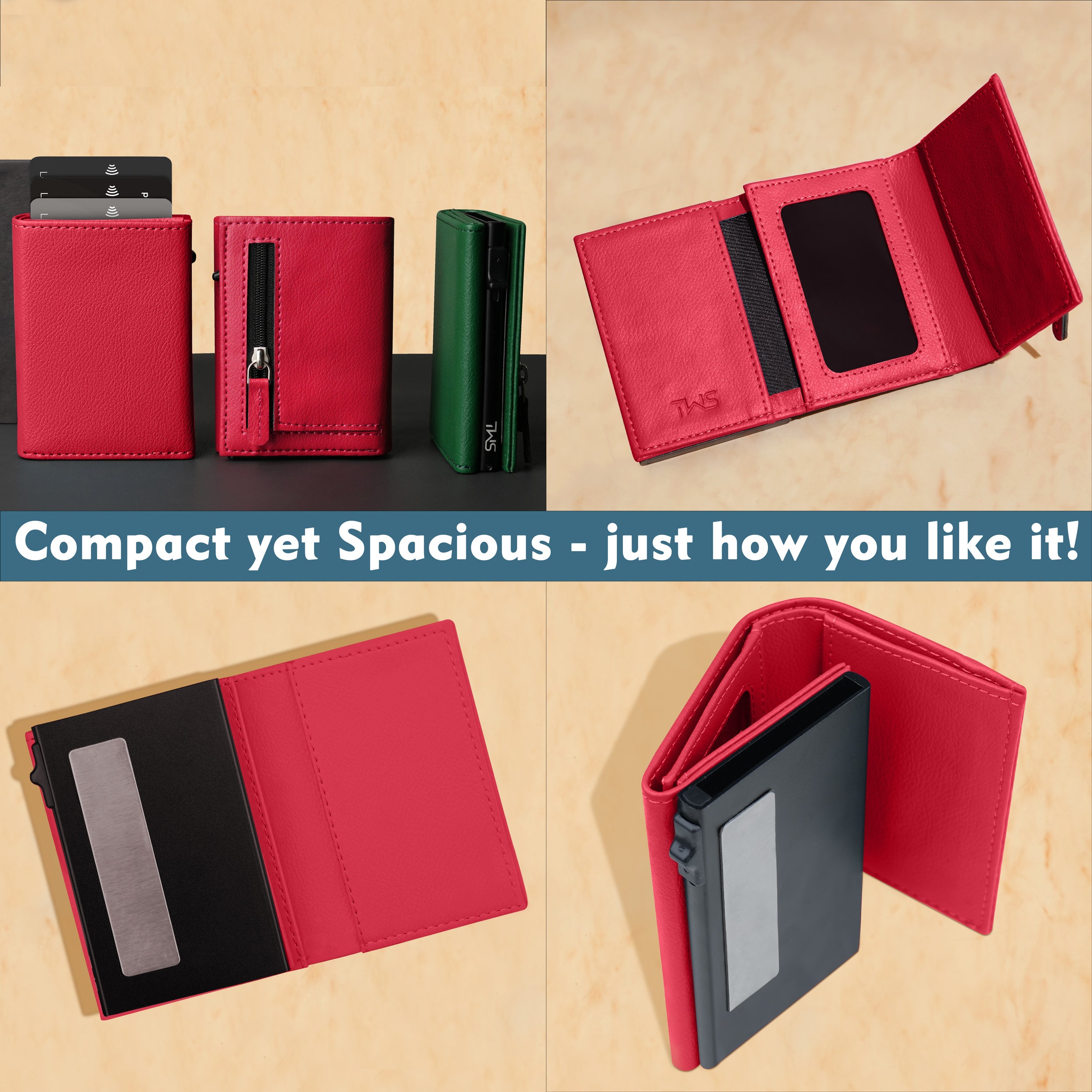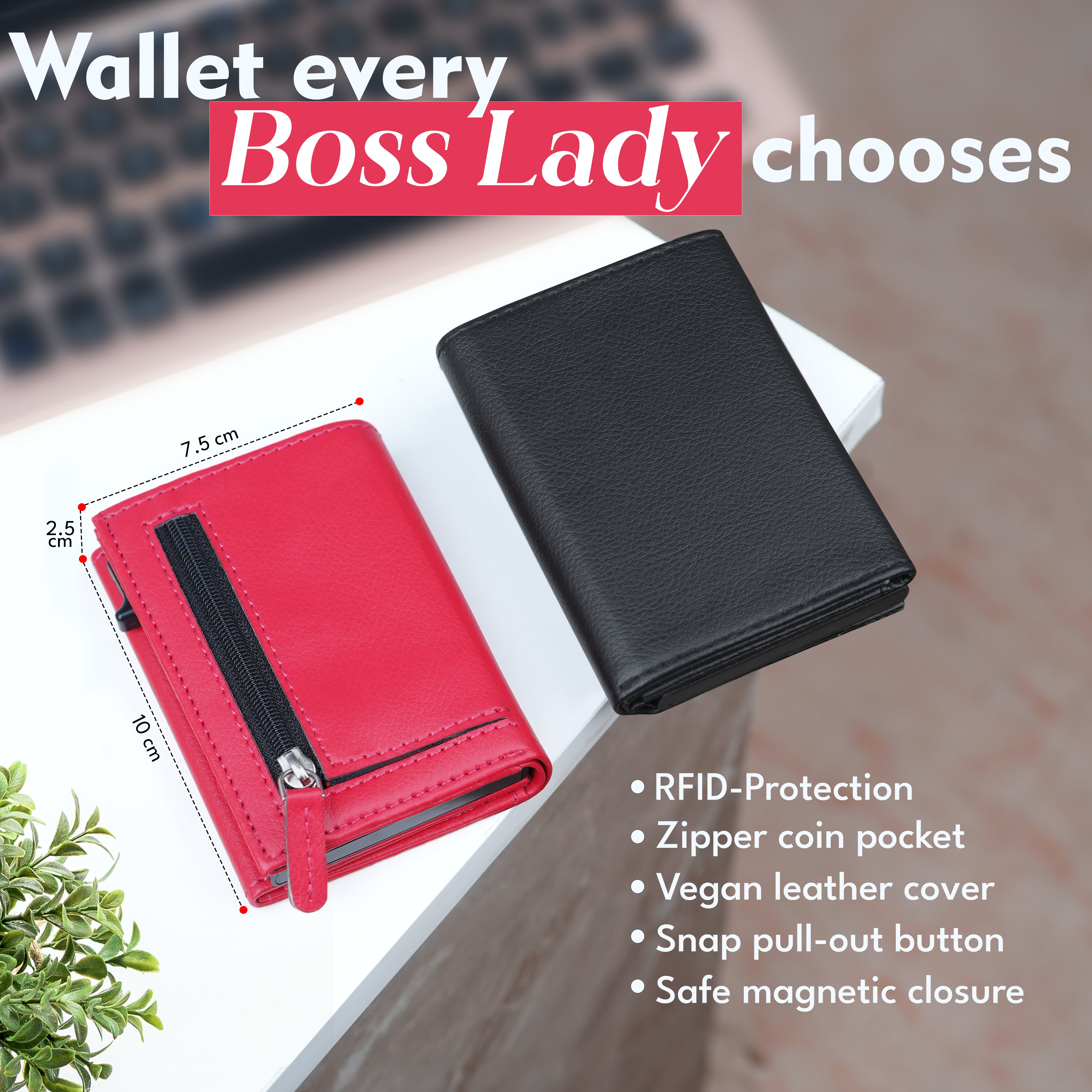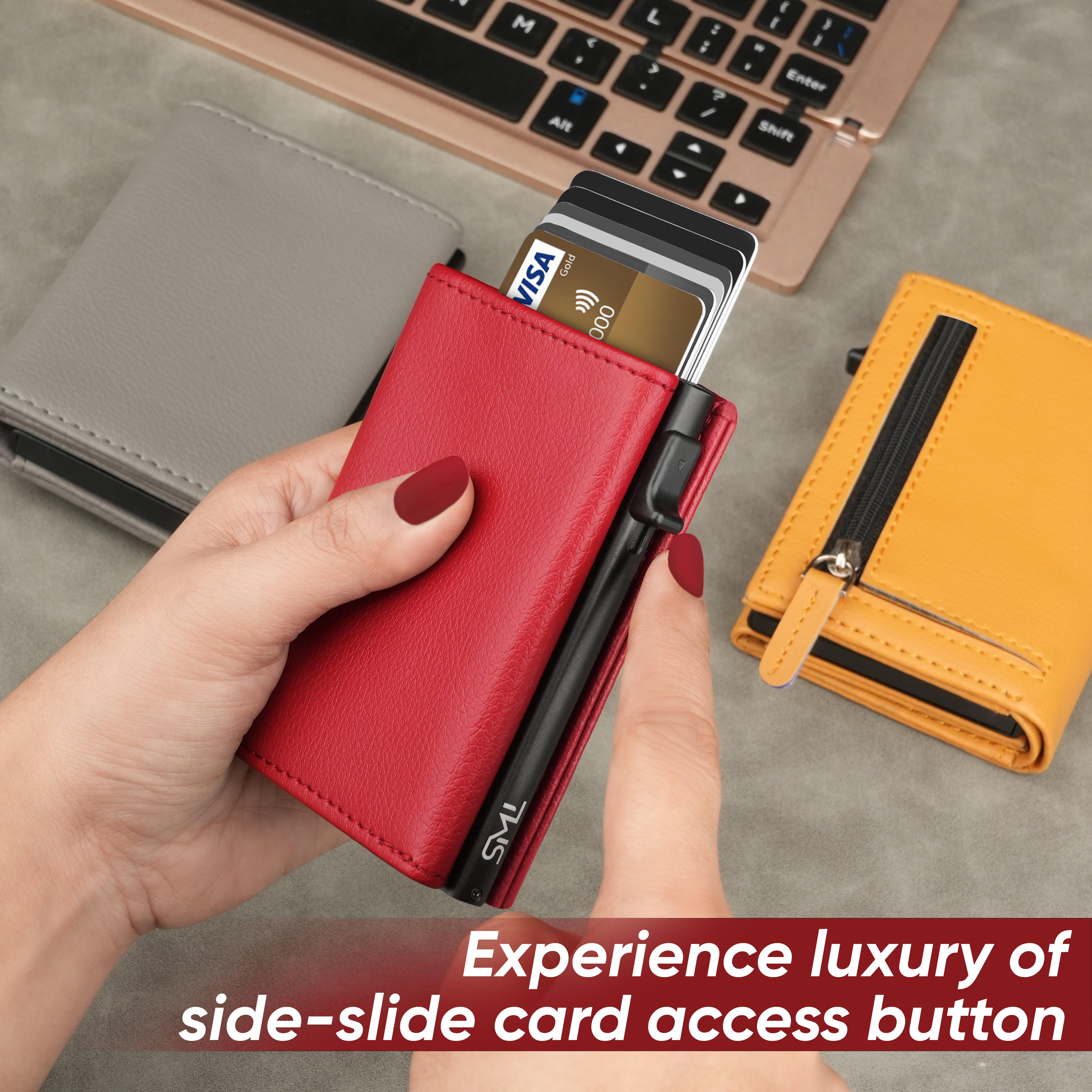 This stylish wallet combines sleek design, bold color choices, cutting-edge security features such as an RFID-blocking cardholder that pops up, and the kind of heartfelt charm that few others can provide. This wallet matches any outfit whether one is going to work, running errands, or attending an event.
