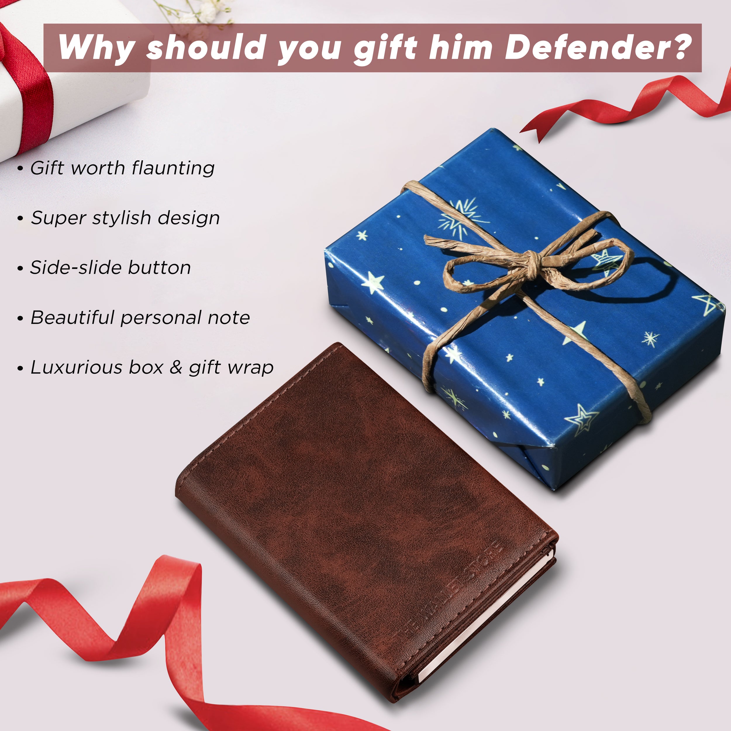 But what really makes this gift special is the full gifting experience it provides. The Defender wallet comes stunningly presented in a high-quality box, is wrapped in opulent gift wrapping, and features a personalized message card - all set to surprise and impress, straight from the box.