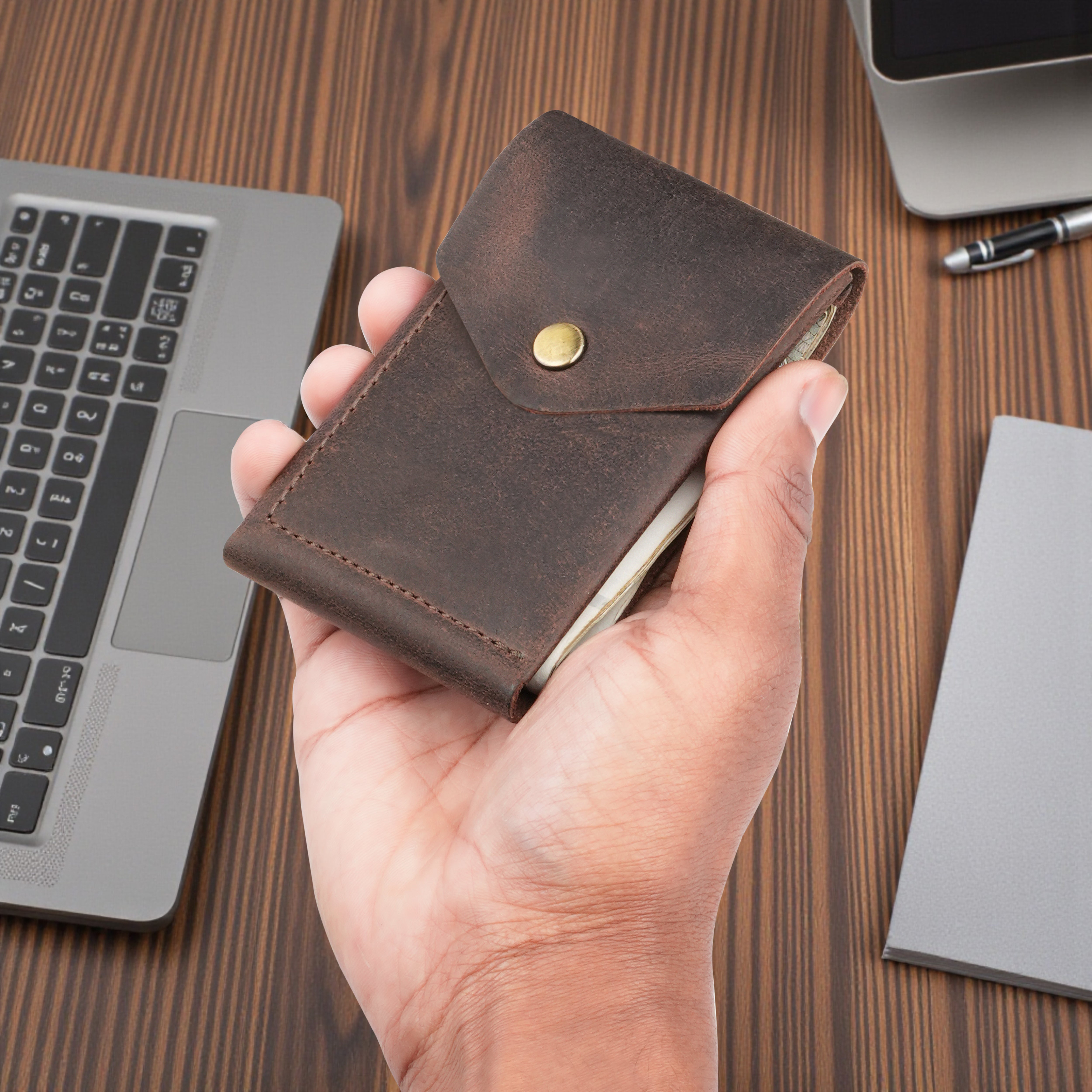 The smart pull string mechanism lets you access up to four cards instantly, while the snap button closure keeps everything secure. Inside, a spacious cash section allows you to carry folded currency with ease. Sleek, lightweight, and functional, this wallet blends simplicity with intelligent design. Carry your essentials in a wallet that reflects timeless taste.