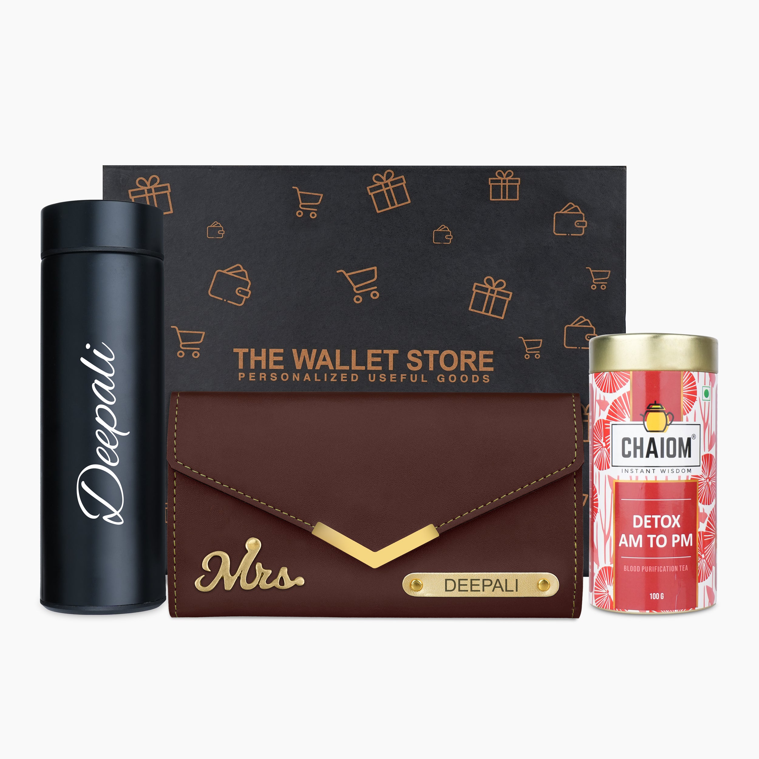Introducing our exquisite Personalized Bliss Trio Gift Set which includes a clutch, bottle & detox tea box gift set, meticulously curated to elevate every moment of relaxation and rejuvenation. Crafted with care and tailored to perfection, this indulgent ensemble promises to pamper your senses and soothe your soul.