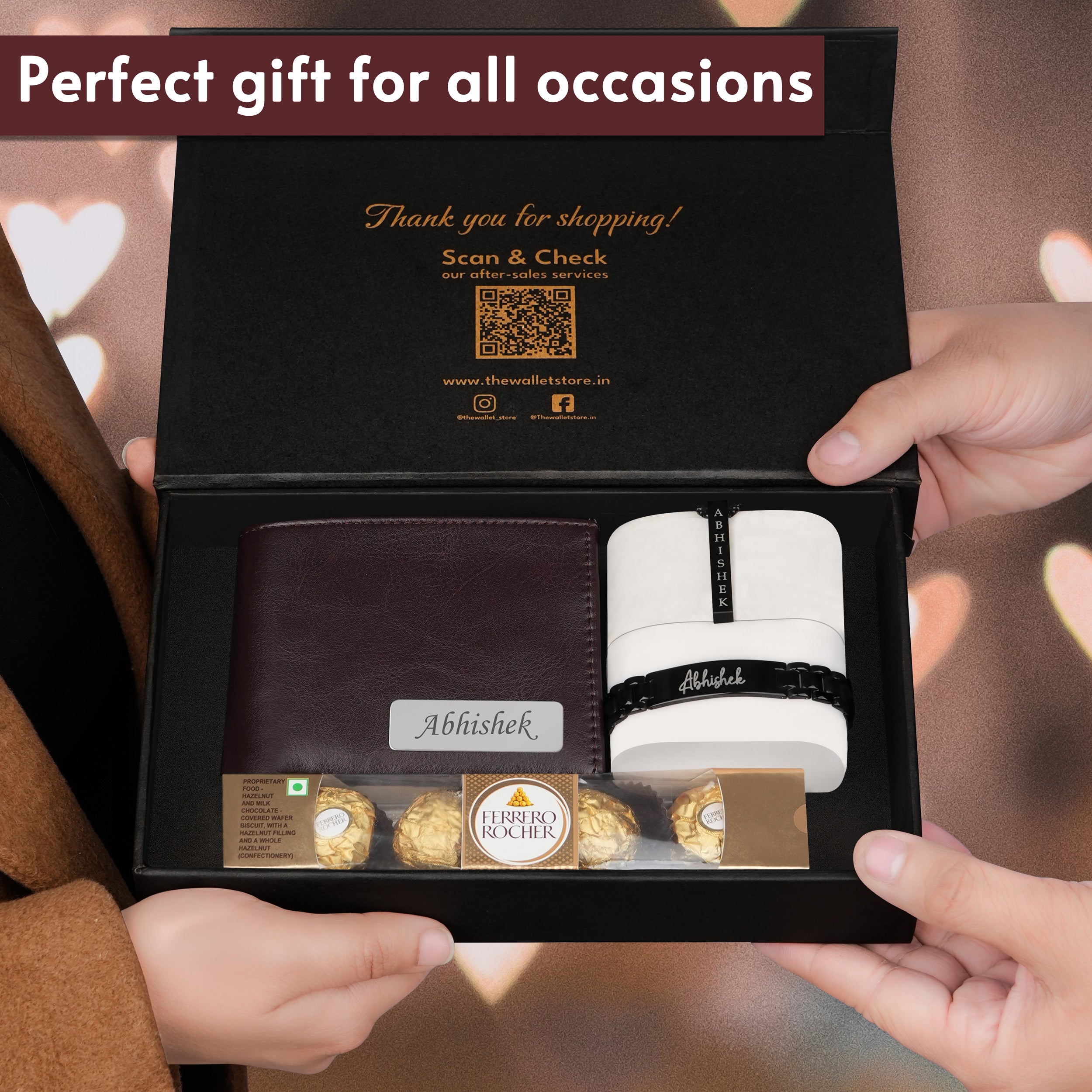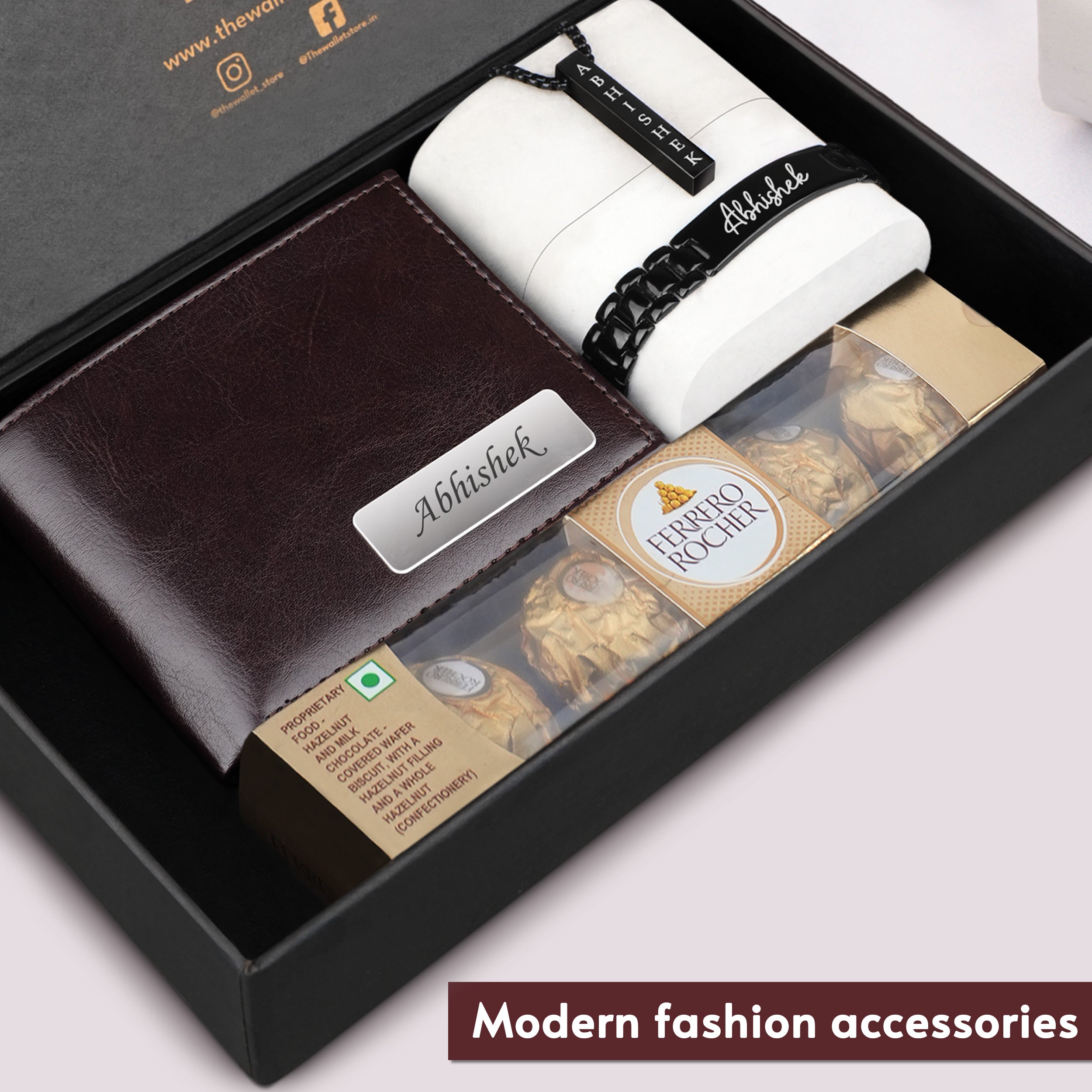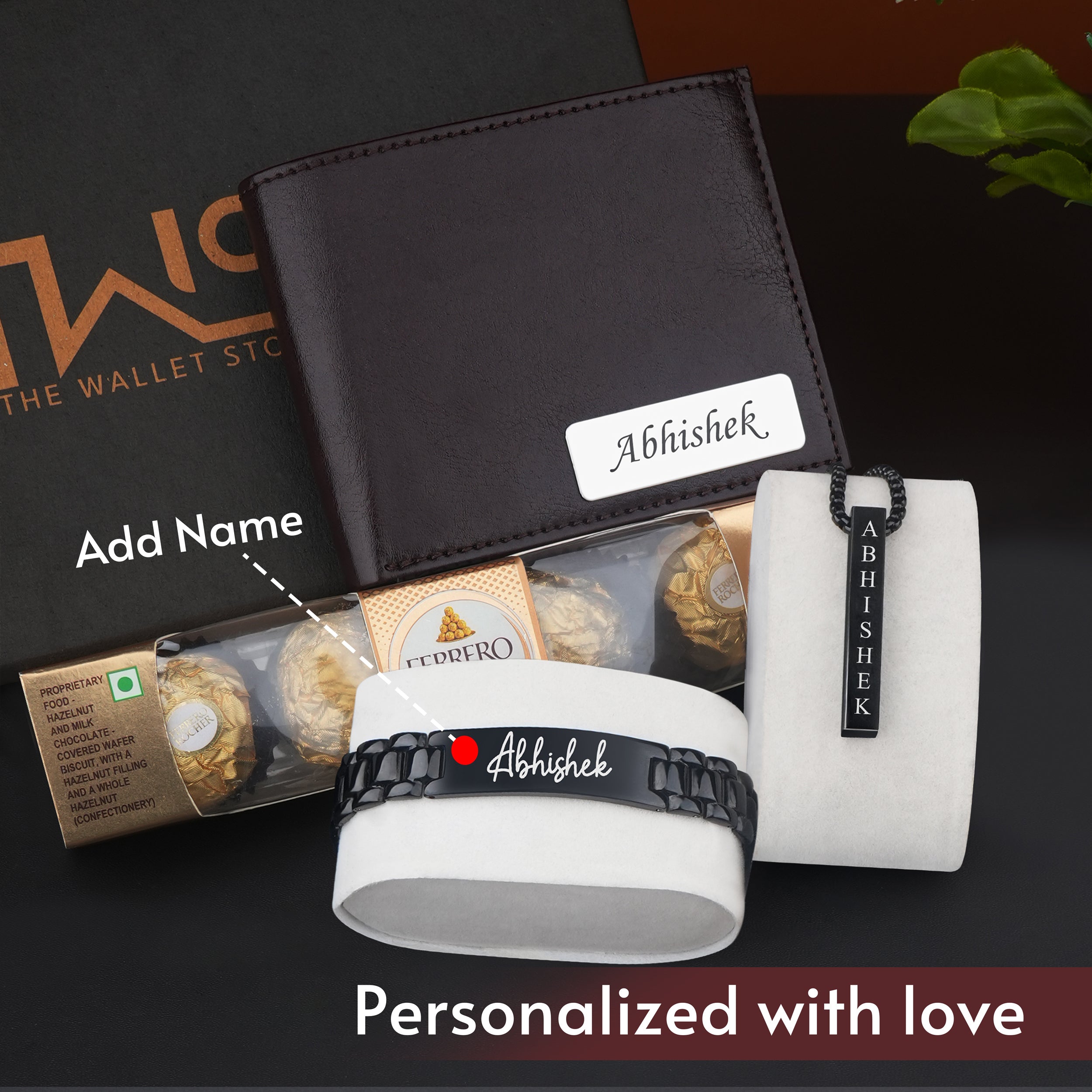 Celebrate life’s special moments with the Personalized Golden Moments Gift Set, a thoughtfully curated gift set that blends luxury, personalization, and indulgence. This exquisite collection features a premium vegan leather wallet personalized with a name, a delightful pack of Ferrero Rocher chocolates, a custom-engraved bracelet, and a personalized name pendant.