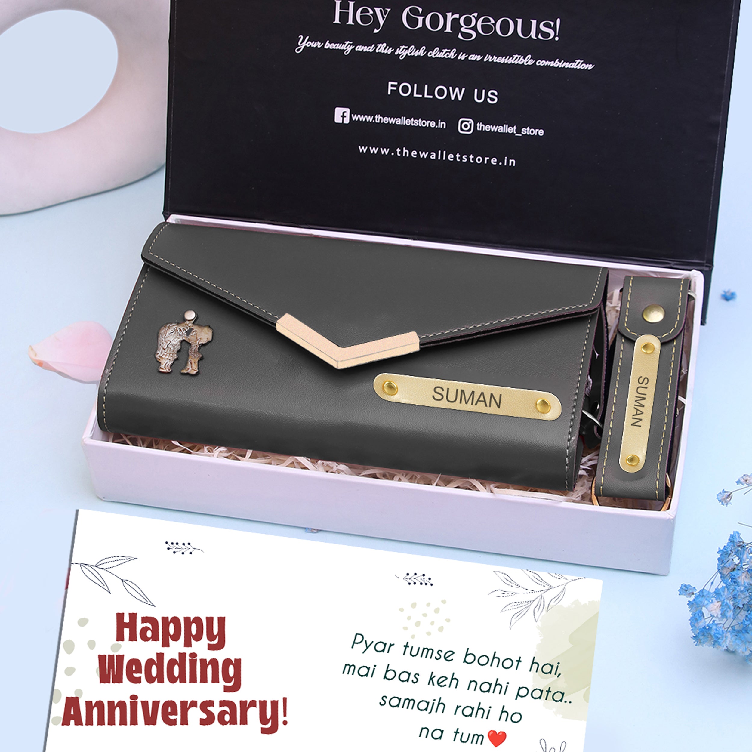 Elevate your accessory collection or delight someone special with our Personalized Premium Clutch & Keychain Gift Set. With its blend of contemporary design, personalized touch, and functional elegance, this set promises to be both a stylish statement and a practical companion, adding a touch of refined charm to everyday moments.