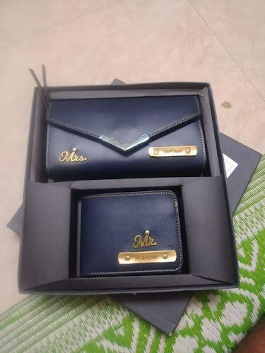 - Personalize with a name (Embossed on a golden strip pasted on the wallet and clutch)