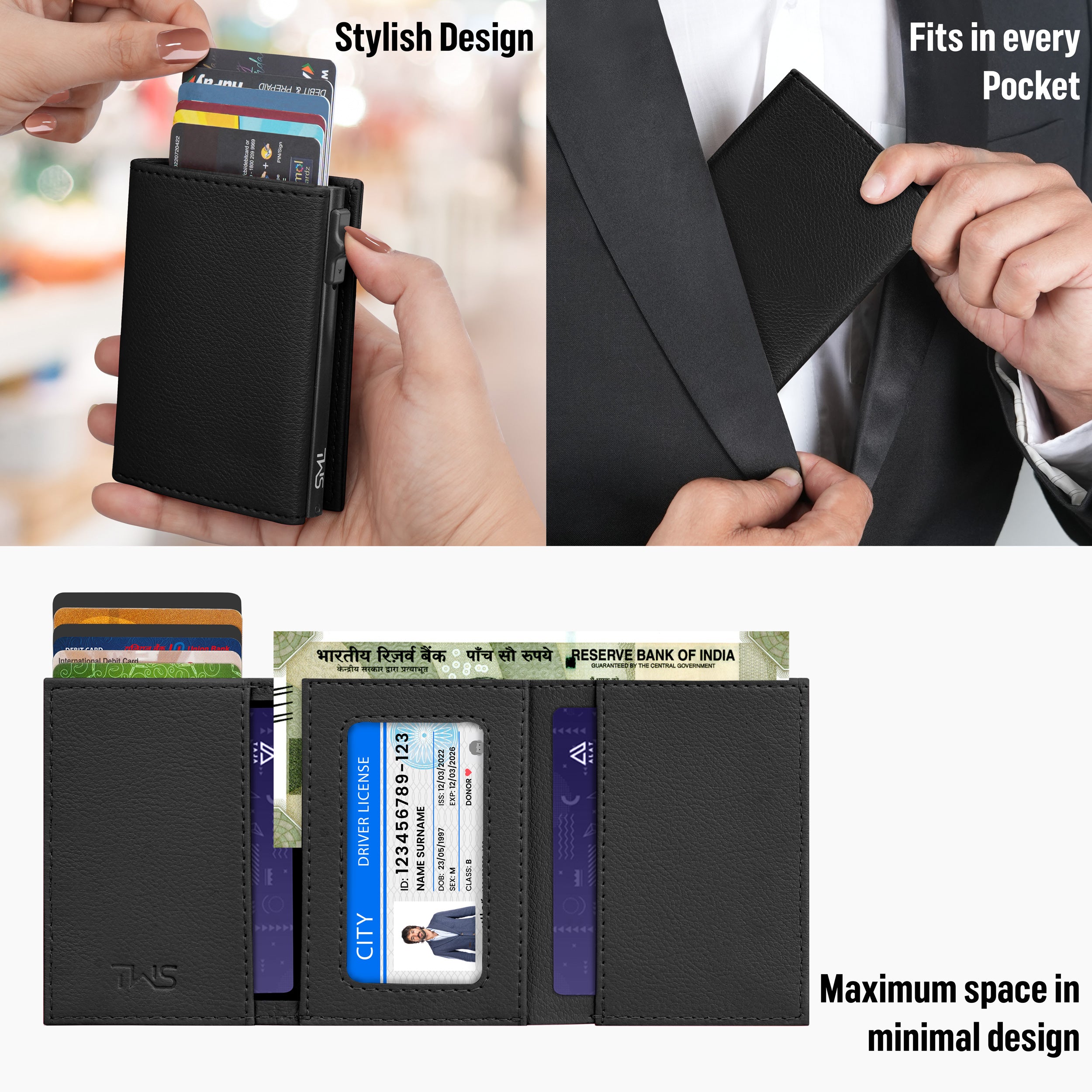 Card carrying capacity: Up to 8 cards (6 cards in metal cardholder, 2 cards in leather cover)